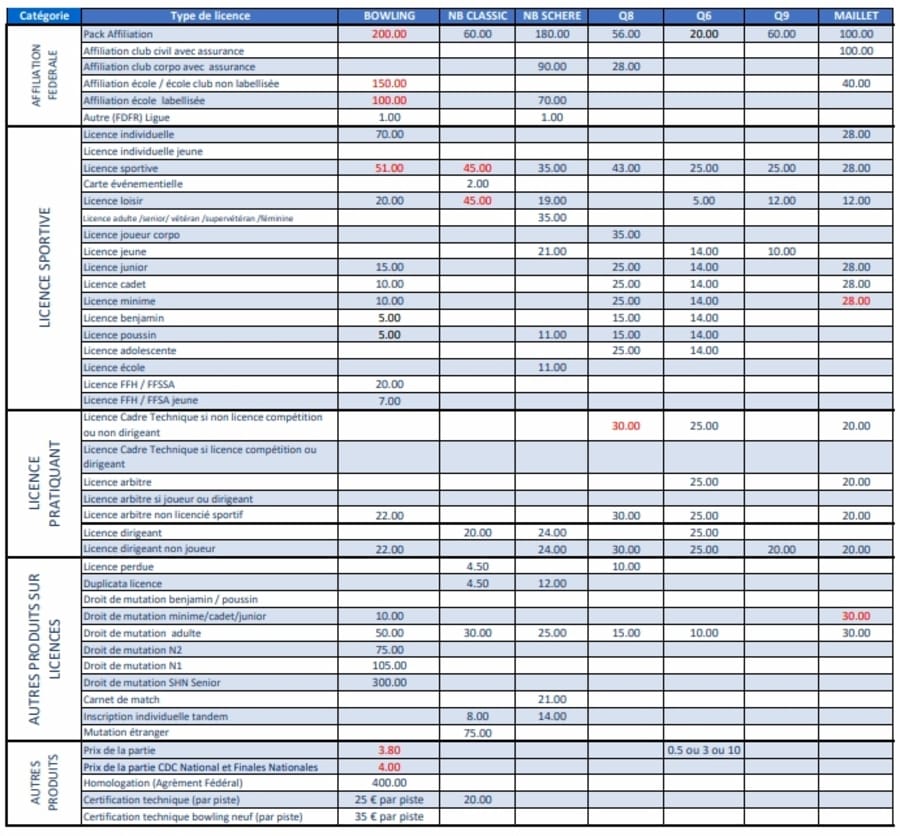 Les tarifs qui changent sont en rouge.